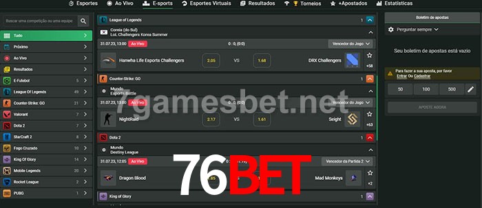 O 76bet oferece uma grande seleção de opções de apostas em e-sports com probabilidades competitivas